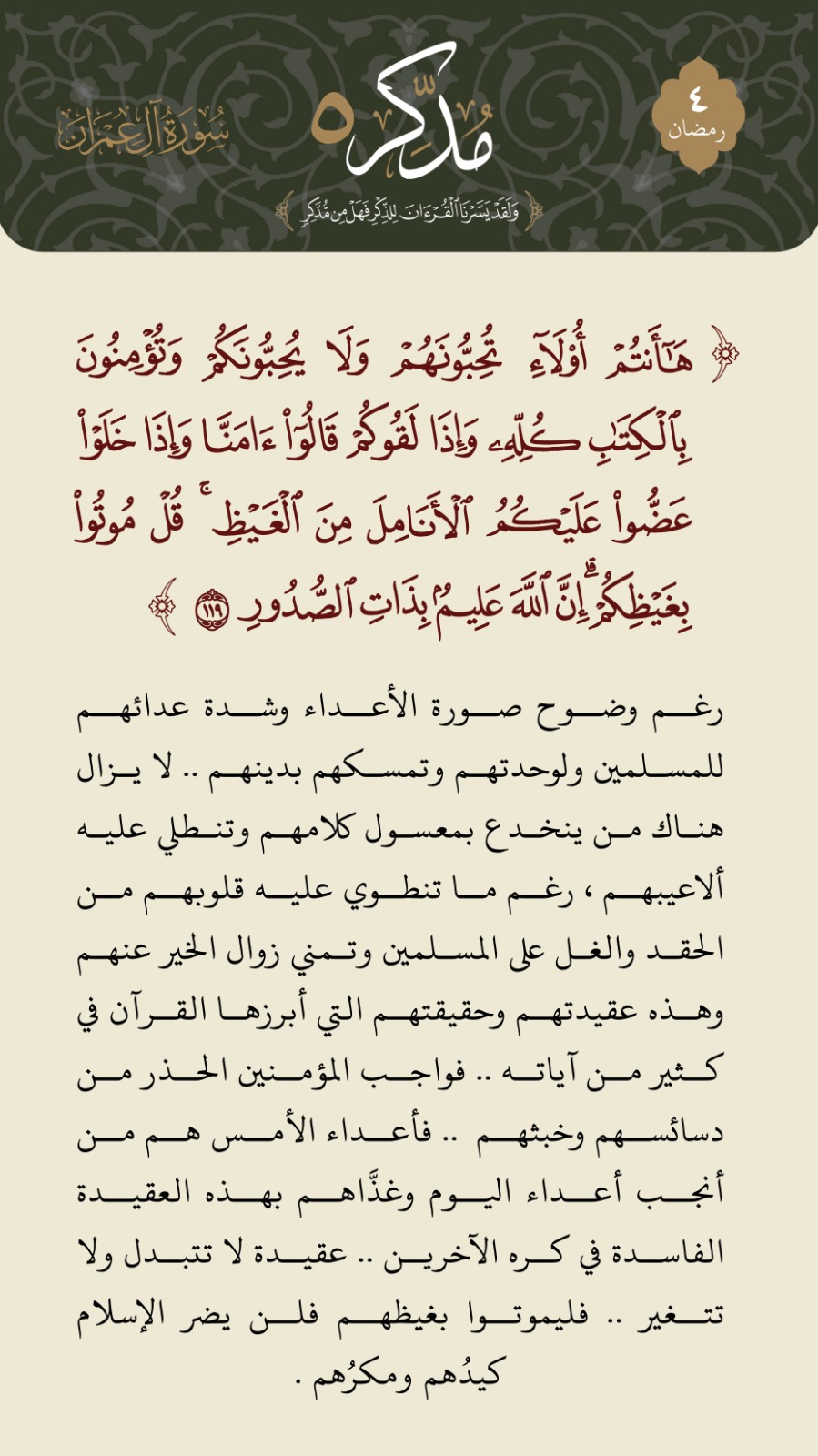 • رغم وضوح صورة الأعداء وشدة عدائهم للمسلمين ولوحدتهم وتمسكهم بدينهم .. لا يزال هناك من ينخدع بمعسول كلامهم وتنطلي عليه ألاعيبهم ، رغم ما تنطوي عليه قلوبهم من الحقد والغل على المسلمين وتمني زوال الخير عنهم وهذه عقيدتهم وحقيقتهم التي أبرزها القرآن في كثير من آياته .. فواجب المؤمنين الحذر من دسائسهم وخبثهم .. فأعداء الأمس هم من أنجب أعداء اليوم وغذاهم بهذه العقيدة الفاسدة في كره الآخرين .. عقيدة لا تتبدل ولا تتغير .. فليموتوا بغيظهم فلن يضر الإسلام كيدُهم ومكرُهم.