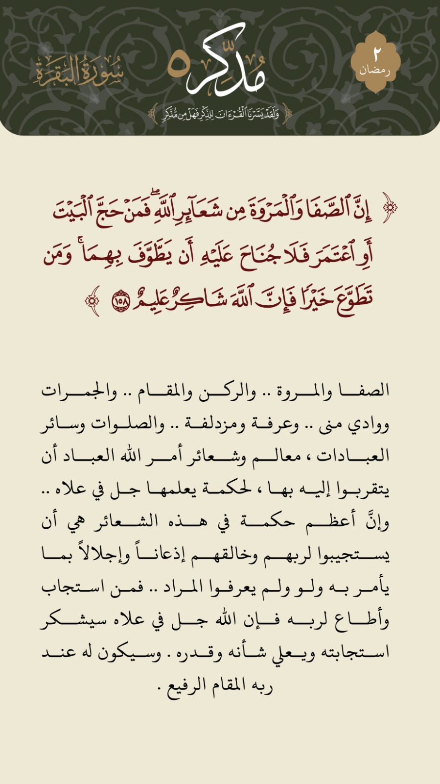 ﴿إِنَّ الصَّفَا وَالْمَرْوَةَ مِن شَعَائِرِ اللَّهِ فَمَنْ حَجَّ الْبَيْتَ أَوِ اعْتَمَرَ فَلَا جُنَاحَ عَلَيْهِ أَن يَطَّوَّفَ بِهِمَا وَمَن تَطَوَّعَ خَيْرًا فَإِنَّ اللَّهَ شَاكِرٌ عَلِيمٌ﴾