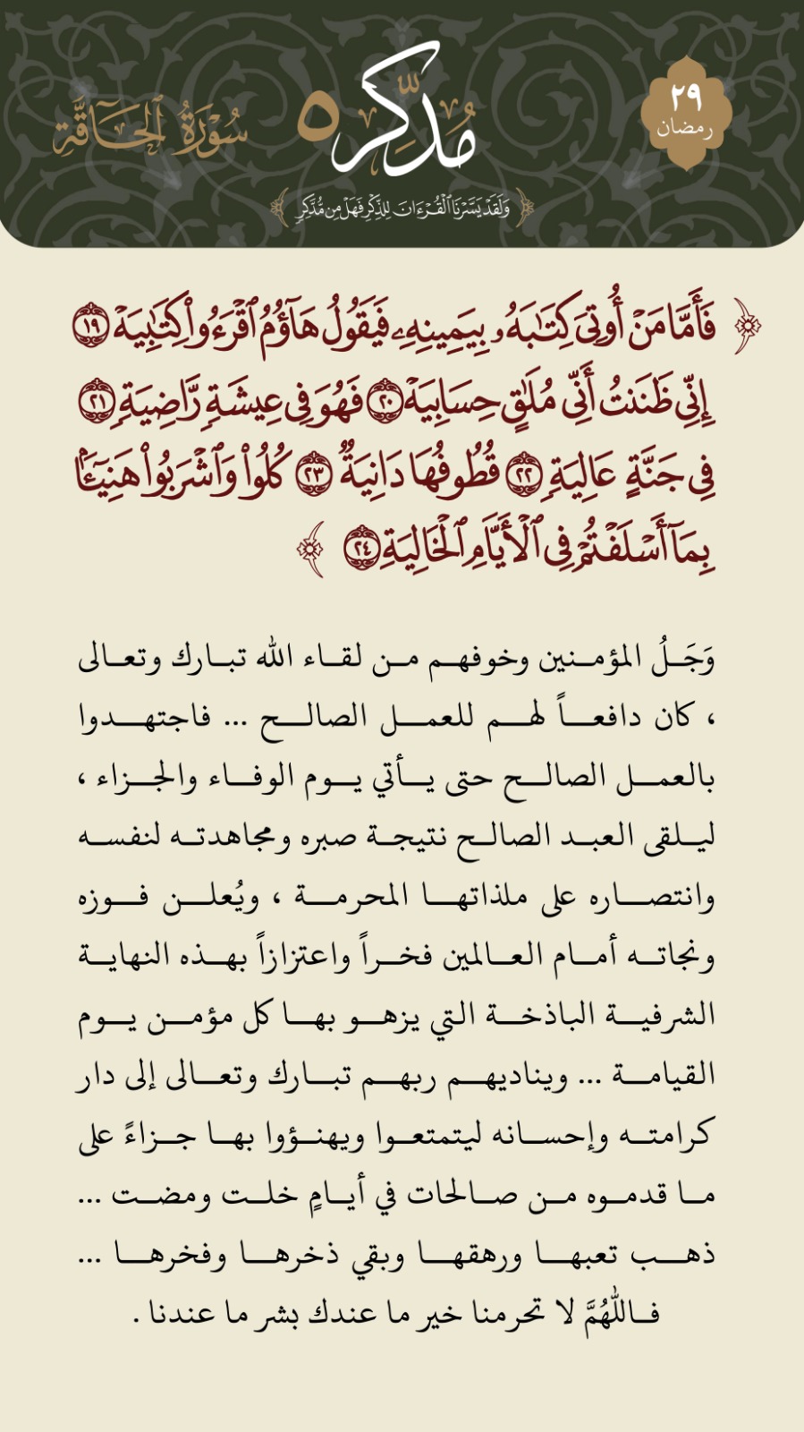 ﴿فَأَمَّا مَنْ أُوتِيَ كِتَابَهُ بِيَمِينِهِ فَيَقُولُ هَاؤُمُ اقْرَءُوا كِتَابِيَهْ . إِنِّي ظَنَنتُ أَنِّي مُلَاقٍ حِسَابِيَهْ . فَهُوَ فِي عِيشَةٍ رَّاضِيَةٍ . فِي جَنَّةٍ عَالِيَةٍ . قُطُوفُهَا دَانِيَةٌ . كُلُوا وَاشْرَبُوا هَنِيئًا بِمَا أَسْلَفْتُمْ فِي الْأَيَّامِ الْخَالِيَةِ﴾