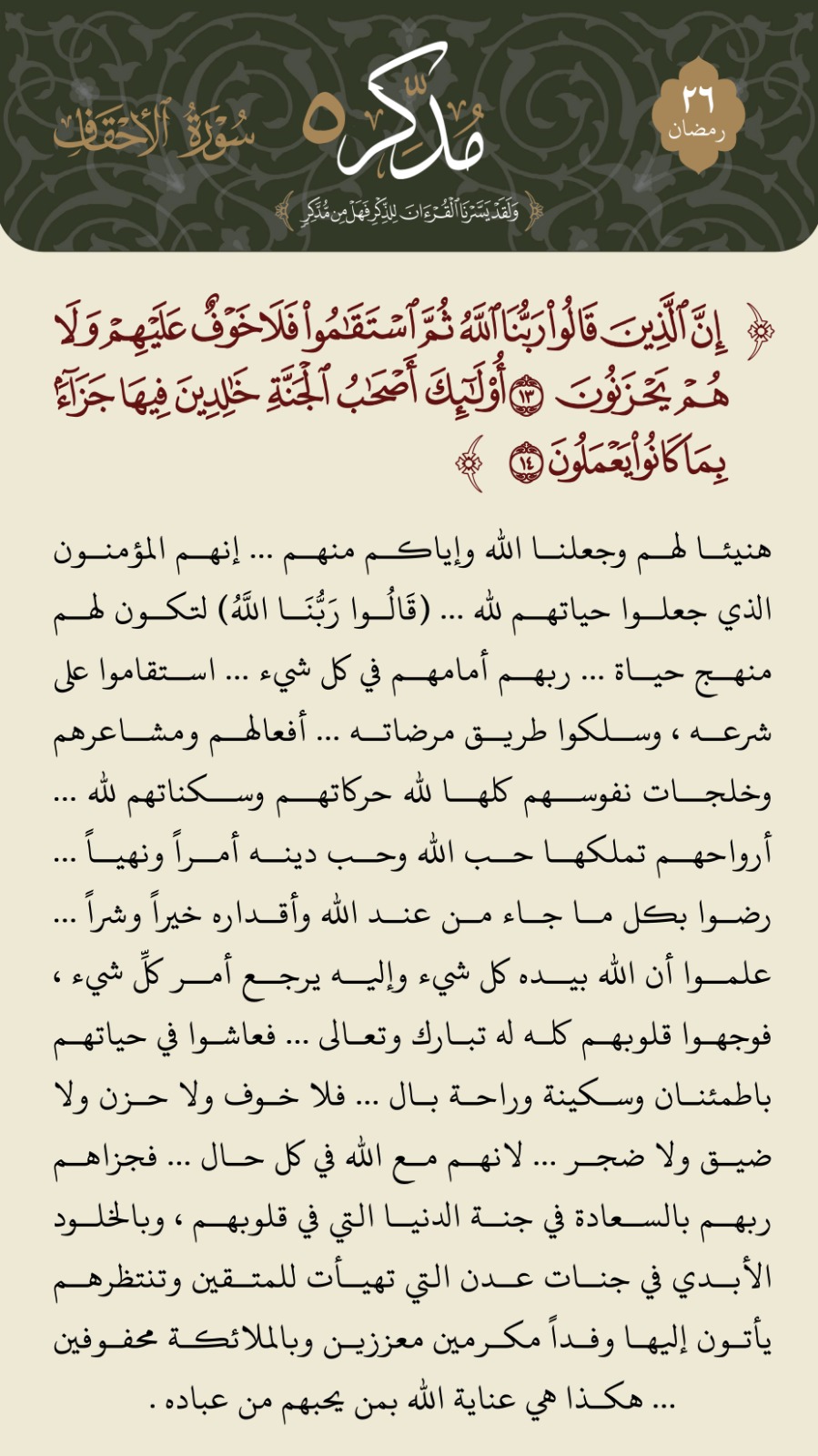 ﴿إِنَّ الَّذِينَ قَالُوا رَبُّنَا اللَّهُ ثُمَّ اسْتَقَامُوا فَلَا خَوْفٌ عَلَيْهِمْ وَلَا هُمْ يَحْزَنُونَ . أُولَئِكَ أَصْحَابُ الْجَنَّةِ خَالِدِينَ فِيهَا جَزَاءً بِمَا كَانُوا يَعْمَلُونَ﴾