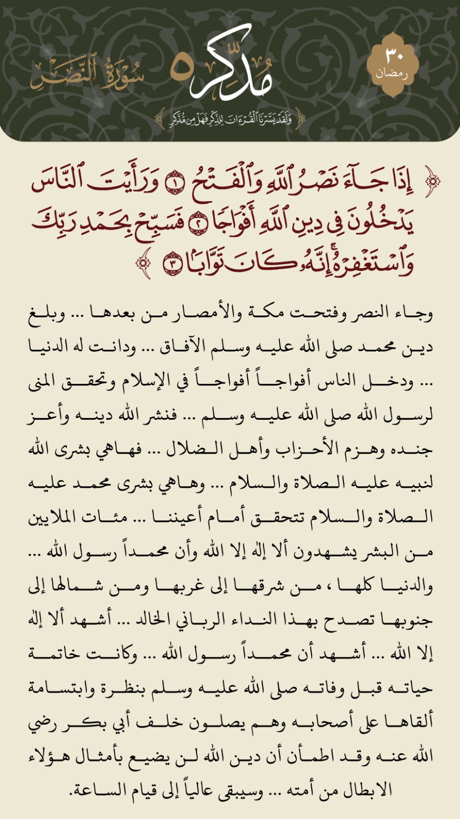 ﴿إِذَا جَاءَ نَصْرُ اللَّهِ وَالْفَتْحُ . وَرَأَيْتَ النَّاسَ يَدْخُلُونَ فِي دِينِ اللَّهِ أَفْوَاجًا . فَسَبِّحْ بِحَمْدِ رَبِّكَ وَاسْتَغْفِرْهُ إِنَّهُ كَانَ تَوَّابًا﴾