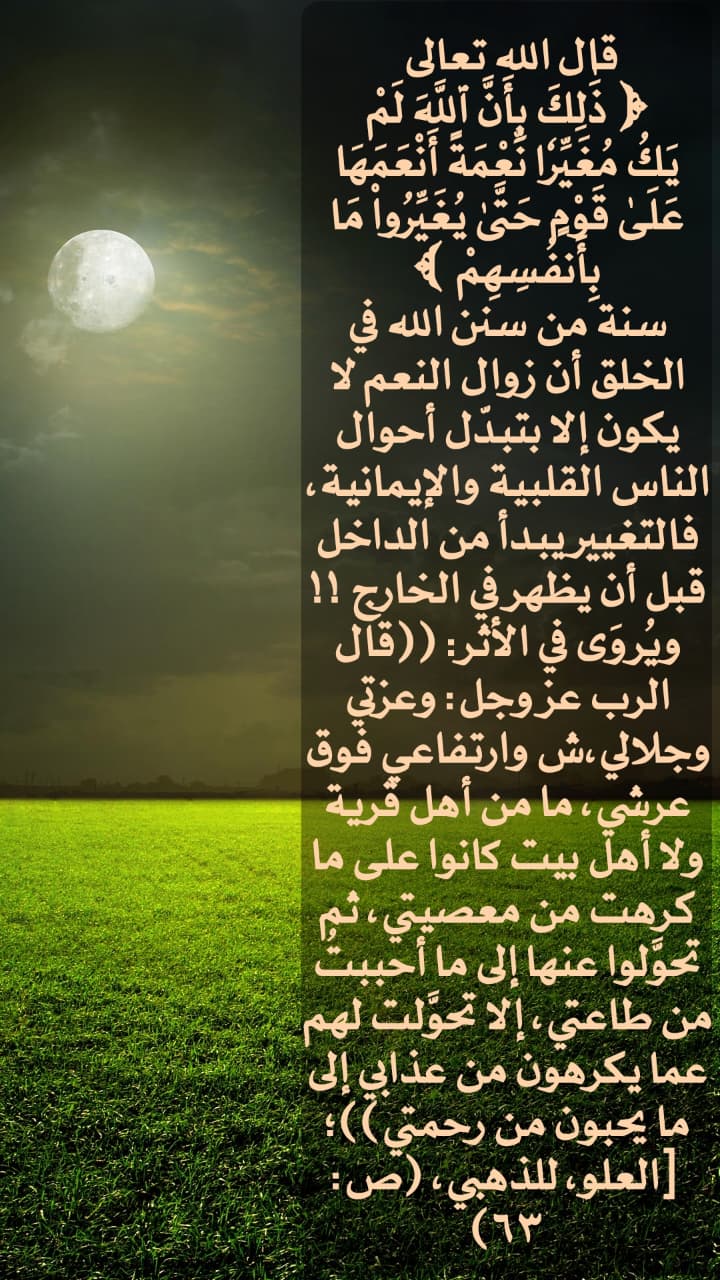 سنة من سنن الله في الخلق أن زوال النعم لا يكون إلا بتبدل أحوال الناس القلبية والإيمانية فالتغيير يبدأ من الداخل قبل أن يظهر في الخارج !!