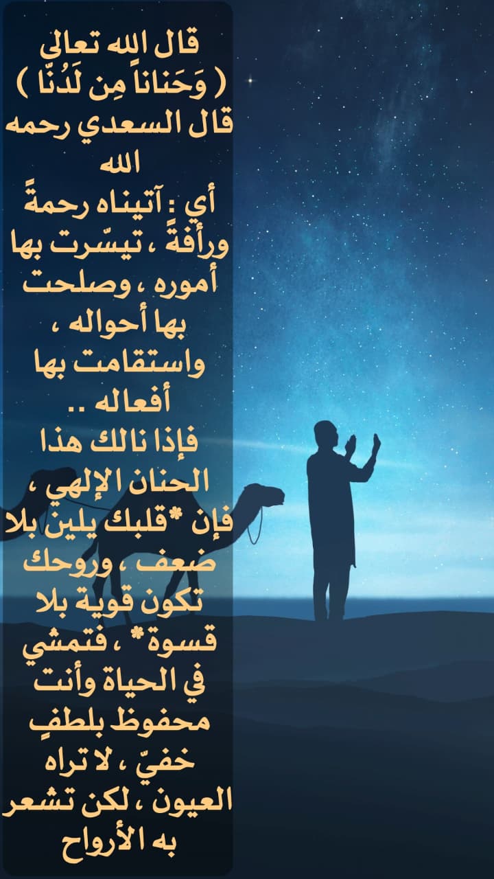 • أي : آتيناه رحمةً ورأفة ، تيسرت بها أموره ، وصلحت بها أحواله ، واستقامت بها أفعاله .. فإذا نالك هذا الحنان الإلهي ، فإن قلبك يلين بلا ضعف ، وروحك تكون قوية بلا قسوة ، فتمشي في الحياة وأنت محفوظ بلطف خفي ، لا تراه العيون ، لكن تشعر به الأرواح.