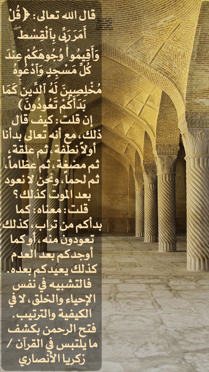 ﴿قُلْ أَمَرَ رَبِّي بِالْقِسْطِ وَأَقِيمُوا وُجُوهَكُمْ عِندَ كُلِّ مَسْجِدٍ وَادْعُوهُ مُخْلِصِينَ لَهُ الدِّينَ كَمَا بَدَأَكُمْ تَعُودُونَ﴾